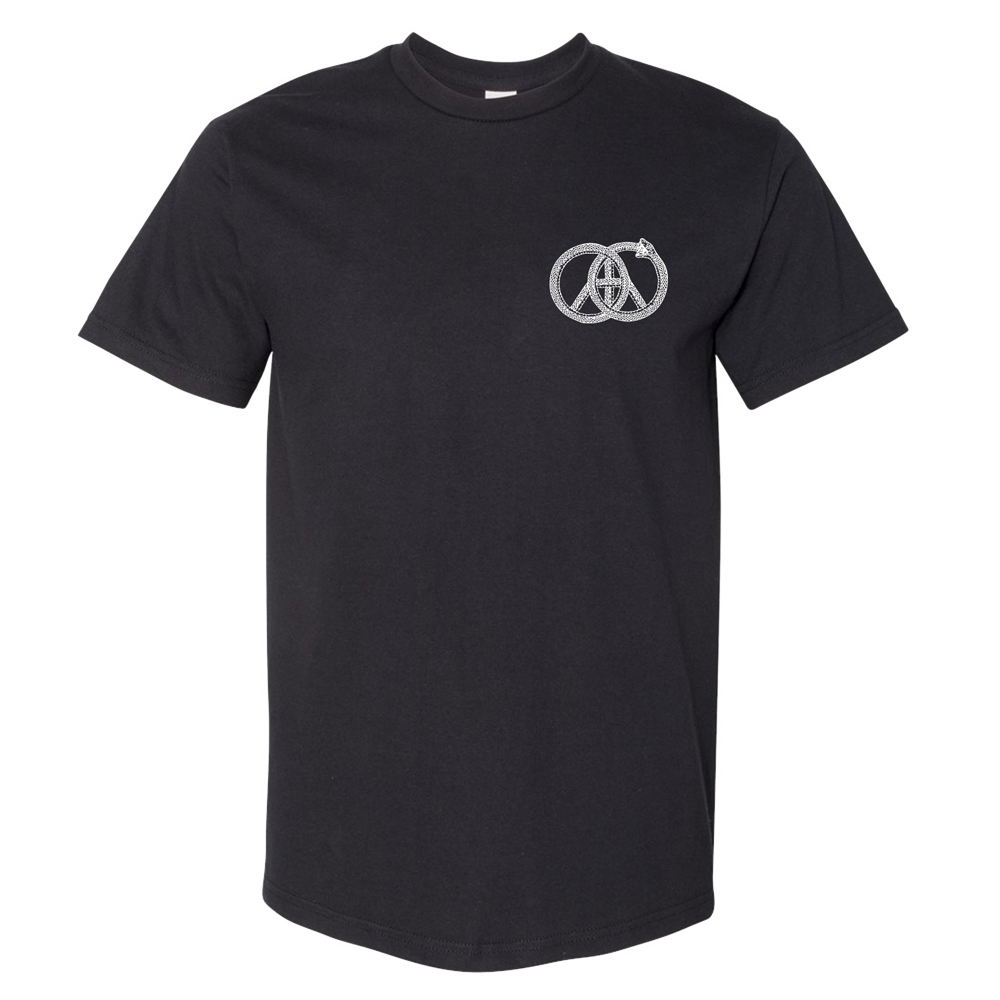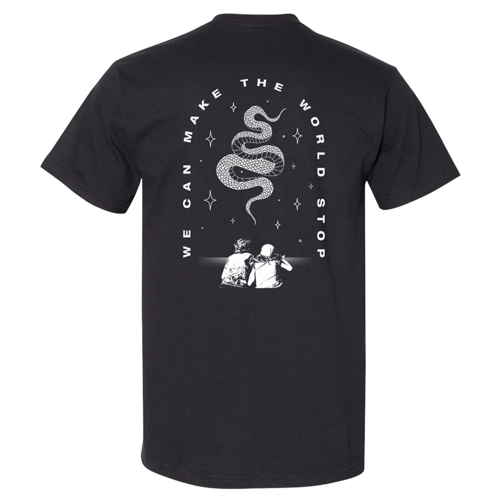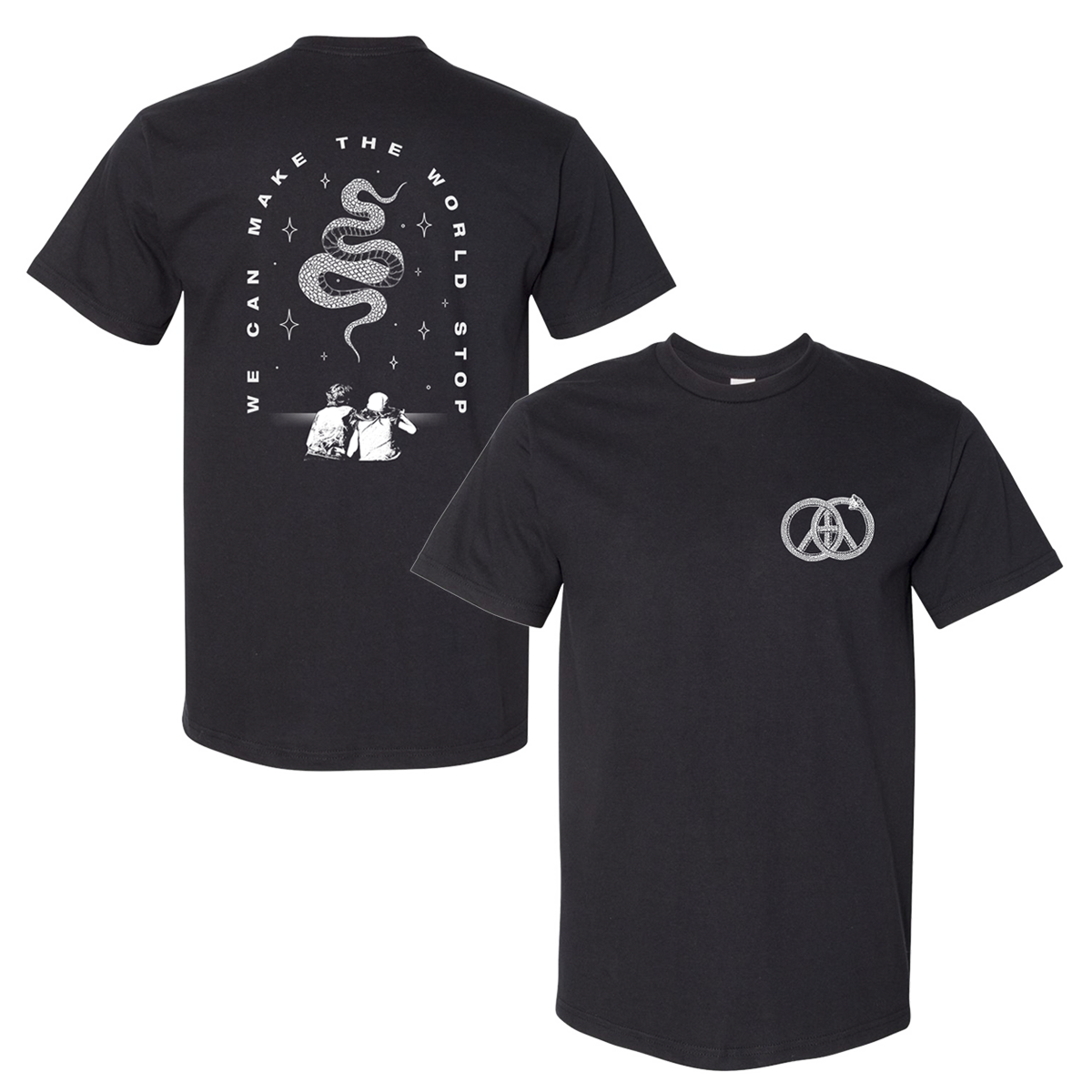 Black unisex tee shirt featuring The Glitch Mob Ouroboros logo printed on the front and We Can Make the World Stop artwork printed on the back.